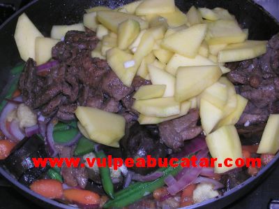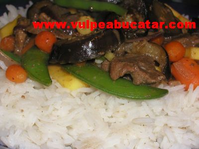 Se adaugă apoi legumele şi se prăjesc aproximativ 5 minute. Se pune carnea şi feliile de mango; se mai amestecă înca 3 minute. Se serveşte cu garnitură de orez.Copyright ©2004–2020 vulpeabucatar.com