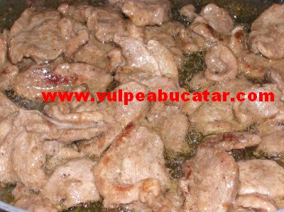Într-o tigaie se încinge o lingură de ulei şi se prăjeşte raţa 5 minute la foc mare. Când este gata se dă la o parte din tigaie şi se păstrează la cald.3