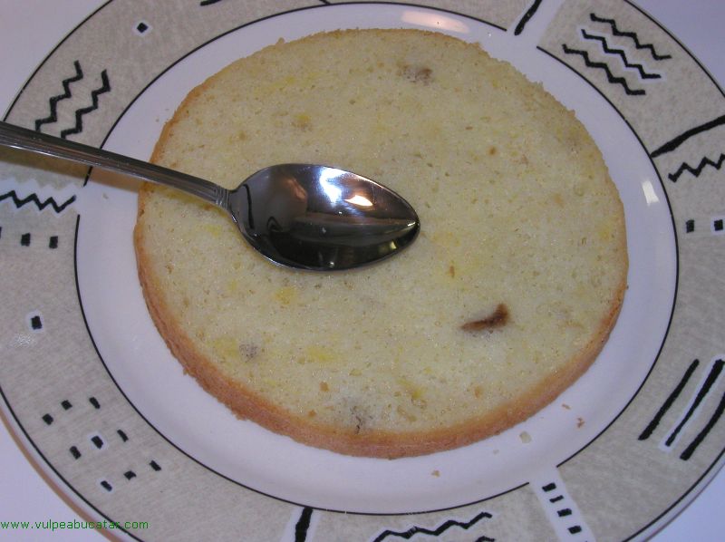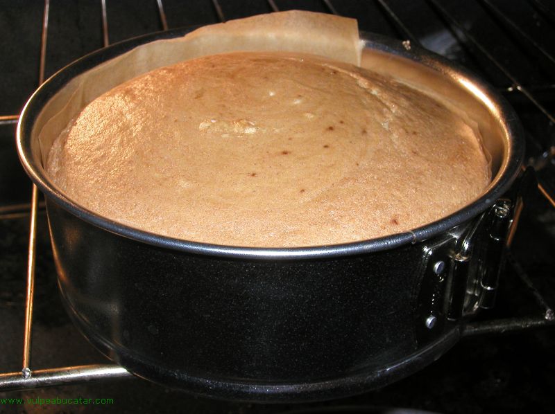 Se face un pandispan din 6 oua, 6 linguri de faina si 6 de zahar. Eu am folosit o forma cu diametrul de 8” (20cm).Se da drumul la cuptor la 350`F. Se bat albusurile spuma tare, se adauga zaharul, se bat pana iar se intaresc. Se adauga galbenusurile, faina si zaharul vanilat. Se amesteca usor de jos in sus pana se incorporeaza faina. Se da la cuptor 350`F aproximativ 30 de minute.2