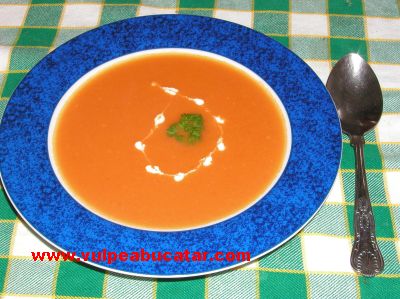 Se potriveşte de sare şi piper. Se lasă să clocotească la foc mediu aproximativ 20 de minute, până se fierb toate legumele. Consistenţa trebuie să fie cea a unei ciorbe normale. Se lasă să se răcească puţin apoi se pune în blender şi se face cremă. Dacă este prea groasă se mai adaugă zeamă. Se serveşte caldă, eventual ornată cu pătrunjel.Copyright ©2004–2020 vulpeabucatar.com
