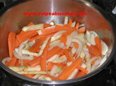 Se taie ceapa julienne. Se incinge uleiul într-o tigaie şi se căleşte ceapa. Se spală şi se curăţă legumele. Se taie julienne sau în cubuleţe de aceeaşi mărime. Într-o oală de 3l se pun legumele şi ceapa călită la fiert, la foc mediu-mare.2