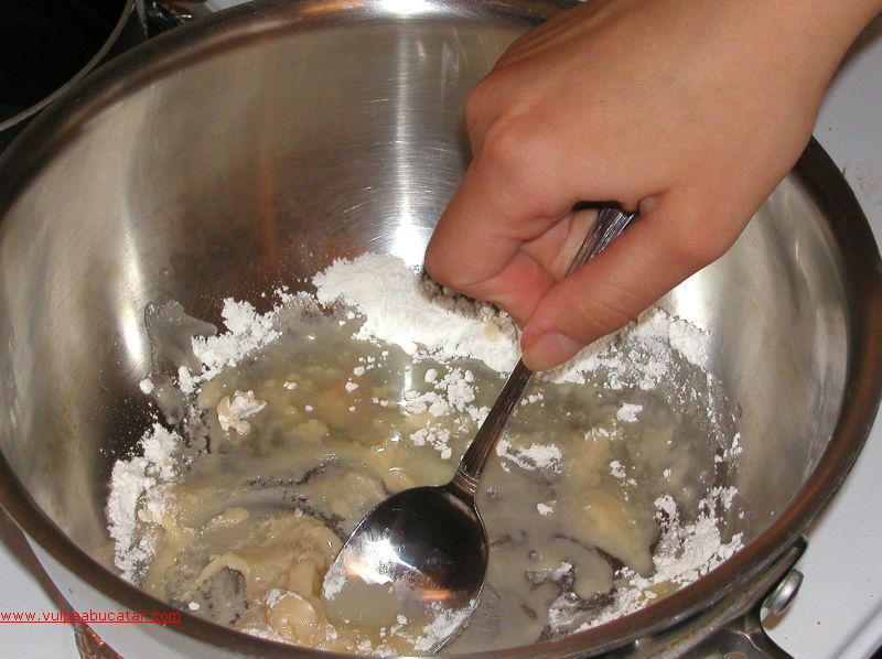 Se amesteca faina cu uleiul pana obtineti o pasta. Se amesteca continuu la foc mediu pana incepe sa se coloreze usor. Se stinge cu zeama de la ciuperci si cu laptele. Se adauga sare si piper dupa gust.2