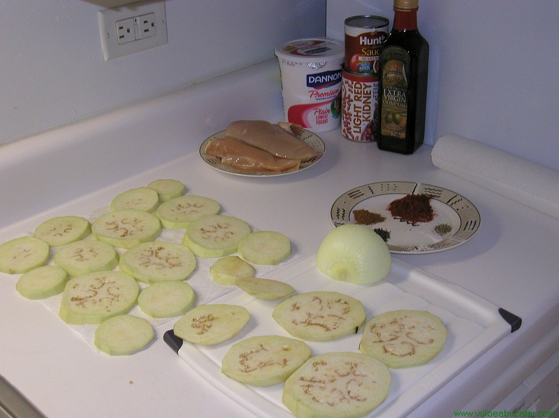 Se spală vânăta şi se curăţă de coajă. Se taie în felii subţiri de aproximativ 0,5 cm. Se sărează şi se pun pe un şervet care sa absoarbă zeama formată. Se lasă 30 de minute. Se aprinde cuptorul - 375°F.2
