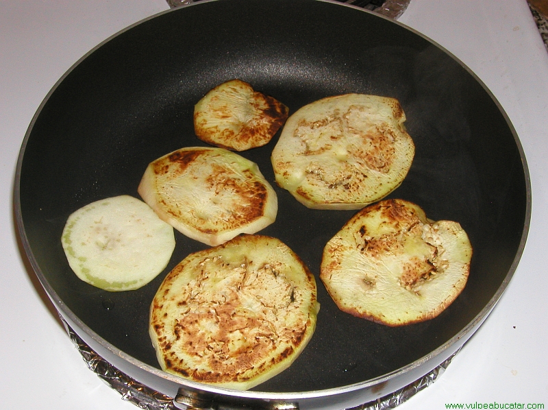 Într-o tigaie(teflon) cu ulei şi se pun vinetele să se frig pe ambele feţe până devin uşor maronii.3