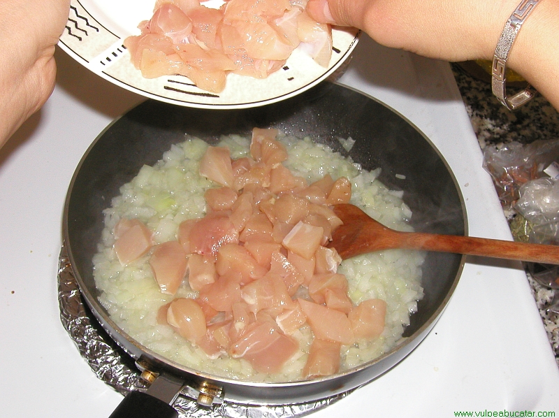 Se pune restul de ulei în tigaie şi se prăjeşte carnea (puiul). Când s-a prăjit se adaugă fasolea scursă, sosul de roşii, cimbrul şi boiaua. Se amestecă.4