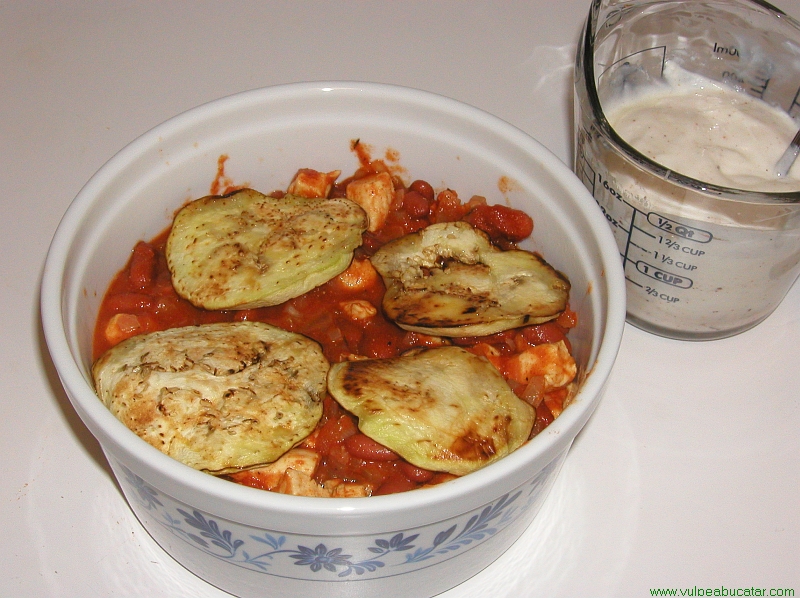 Într-o tava puţin mai înaltă sau o cratiţă se pune primul strat de vinete prăjite, un strat de fasole, vinete, fasole, vinete şi deasupra se toarnă amestecul din iaurt. Se dă la cuptor aproximativ o oră până se rumeneşte.Copyright ©2004–2020 vulpeabucatar.com