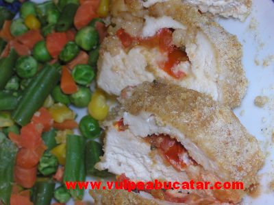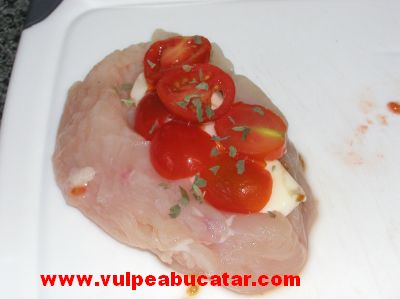 Se spală pieptul de pui. Se face o incizie în diagonală în fiecare piept de pui pentru a crea un buzunar. Roşia se taie rondele de 0,5 cm. În fiecare buzunar se pune o felie de mozarella –lungă cât buzunarul, felii de roşie, busuioc şi piper.2