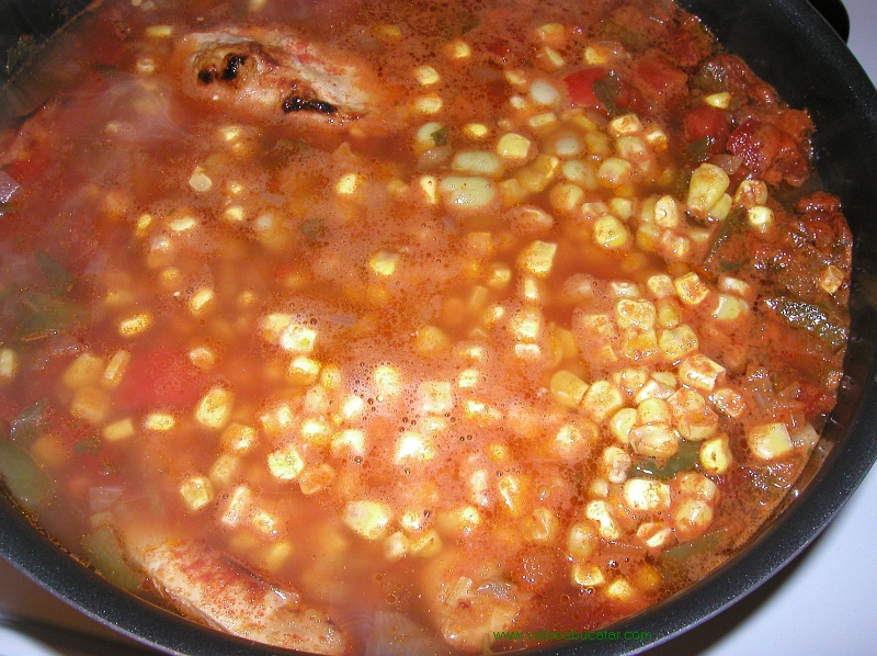 Se adaugă fasolea, porumbul congelat şi puiul. Se mai fierb încă 30-40 de minute până mai scade din zeamă.4