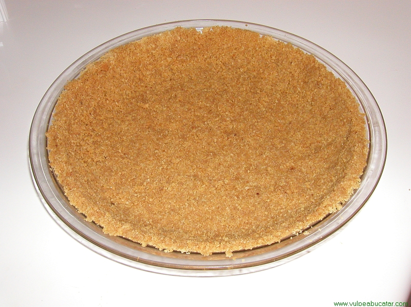 Se dau biscuitii prin razatoare. Se pun intr-o forma rotunda cu diametrul de 23 cm, inalta de 4 cm si se amesteca cu untul topit. Se preseaza pe margini in asa fel incat sa arate ca o crusta. Se da la cuptor 10-15 minute pana se rumeneste usor. Se lasa sa se racoreasca.Crema