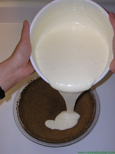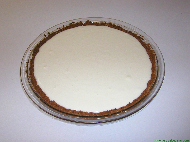 Se pune umplutura in crusta. Se da la foc mic-mediu (325°F) 50 de minute pana se rumeneste frumos.4